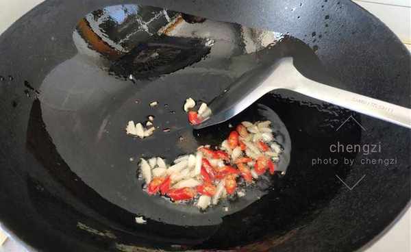 4、炒锅烧热加植物油,加蒜末、小米椒爆出香味。