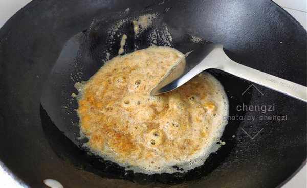 4、炒锅烧热加适量植物油,下入咸蛋黄煸炒一会,会起一些小泡泡。