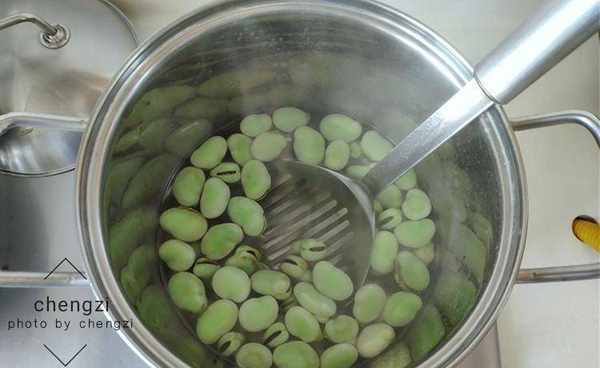 3、小锅加适量清水烧开,加点盐加入蚕豆煮4分钟左右,将蚕豆煮熟捞出。