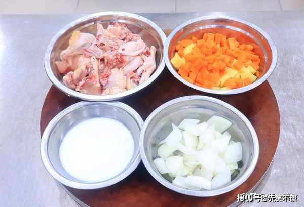 1.首先我们准备一只土鸡剁成均匀小块,土豆一个先切成厚片再切成小块,胡萝卜一根也切成同样的小块,洋葱半个切成片用手掰散,再准备牛奶50克备用。