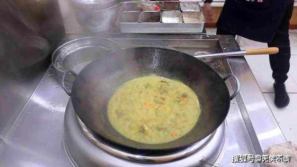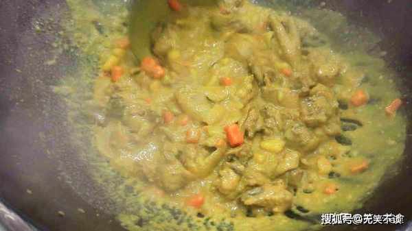 4.然后加入咖喱粉20克,饭店经常会用咖喱膏,食盐5克入底味,汤汁烧开以后转小火焖煮10分钟,这一步非常关键,咖喱只有经过长时间的煮制,香味才能充分释放出,从而渗入到鸡块里面使整道菜香气浓郁。