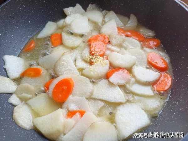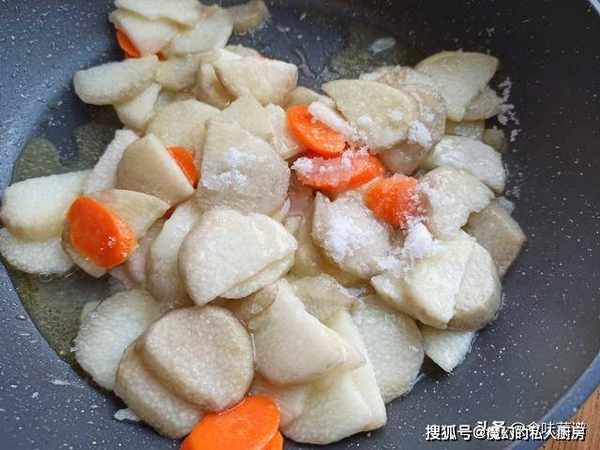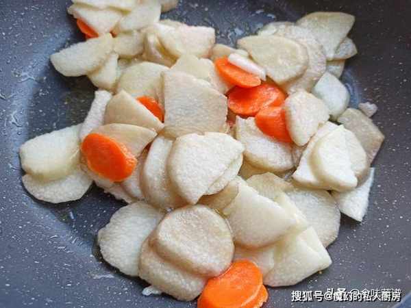 5、下入山药片,继续翻炒几分钟,炒至断生,再次倒入胡萝卜。