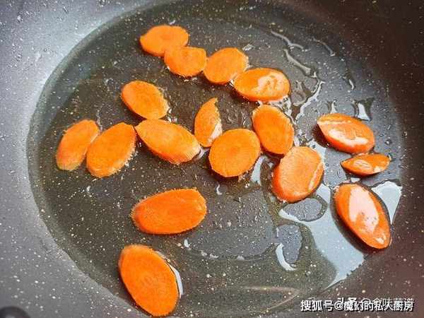4、等待油温7成热,先下入胡萝卜,煸炒一会儿,过一遍油,捞出备用,胡萝卜素是脂溶性营养素,要先过油再入菜。