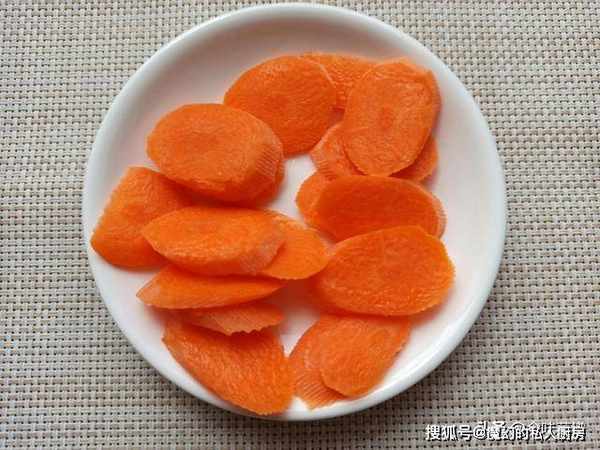 3、胡萝卜清洗干净,切成薄片,不习惯吃外皮也可以去掉。