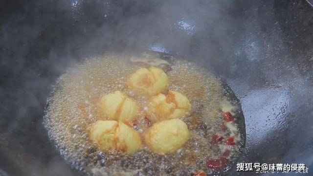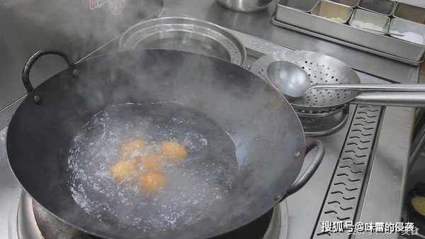 接下来把鸡蛋过油炸一下,锅内烧油,油温五成热时,放入鸡蛋。