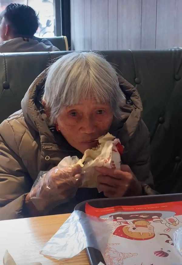 视频中,奶奶头发雪白,脸上布满皱纹,不过穿着却是很干净。只见她坐在店里吃着汉堡时,整个身体是缩在角落里,很不好意思的样子。