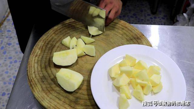 苹果两个削去外皮,将苹果切开去籽,然后切成大小均匀的滚刀块,装入盘中备用。