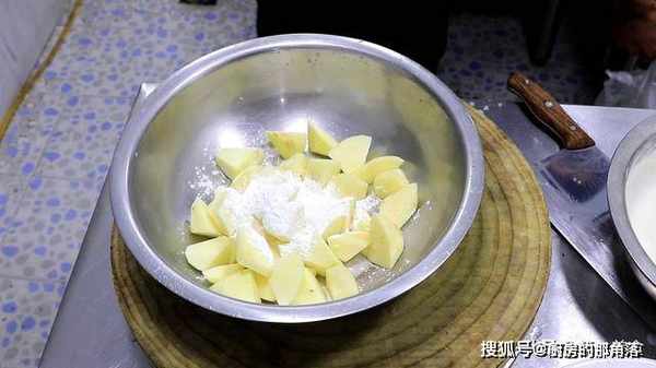 把切好的苹果倒入另一个盆中,放入一勺玉米淀粉拌匀,让每一块苹果都裹上淀粉,先裹上干淀粉,脆皮糊不容易脱浆。