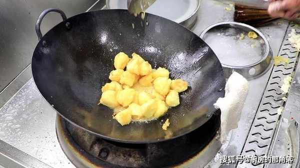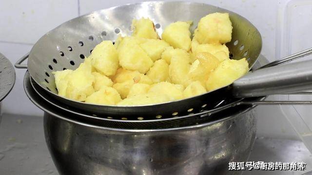 锅内烧油,油温至五成热起锅或开小火,把苹果一块一块放入锅中,油凉以后把锅放在火上,继续下苹果,小火炸3分钟,表皮变硬颜色呈金黄色捞出。升高油温至7成热,倒入苹果复炸30秒左右,捞出控油。