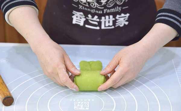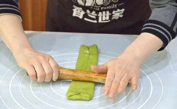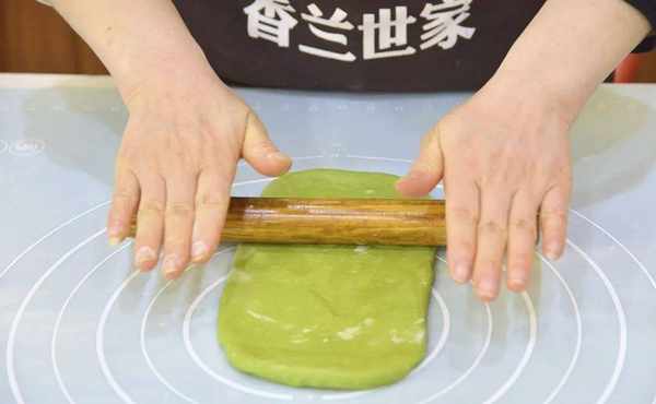 6.再用擀面杖擀长至长度约30cm的长条,然后卷起来,卷到最末端时先将底部按薄在硅胶垫上,再继续卷起来,这样能使收口处更贴合;