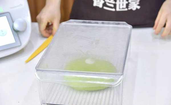 3.再用揉面模式揉4分钟,然后放入黄油,继续揉3分钟,取出揉好的面团收圆放入醒发盒中,现在的温度可以直接放室温醒发40-60分钟;