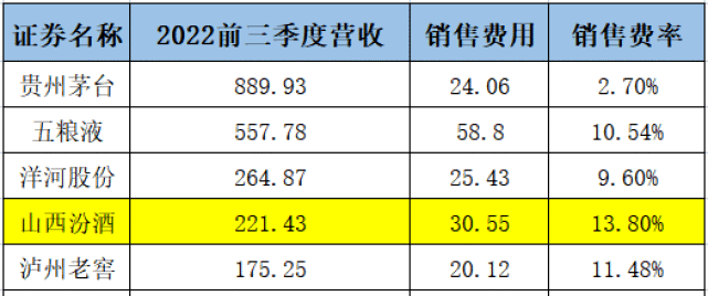 三季报的数据显示,山西汾酒的销售费用高达30.55亿元,相较同期221.43亿元的营收规模来看,销售费率达到了13.8%,远远高于茅台的2.7%、五粮液的10.54%和洋河股份的9.6%,甚至高于泸州老窖的11.48%,比迎驾贡酒、口子窖、顺鑫农业等二三线白酒品牌的营销费率还高。