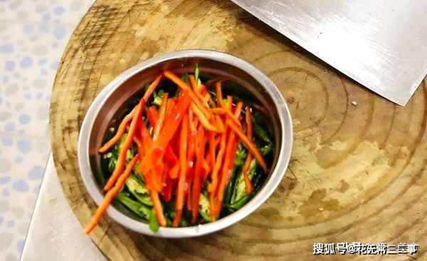 2.线椒一小把,去蒂后斜刀切成片,红椒半个,去籽后切成丝,和线椒放在一起用来配色。