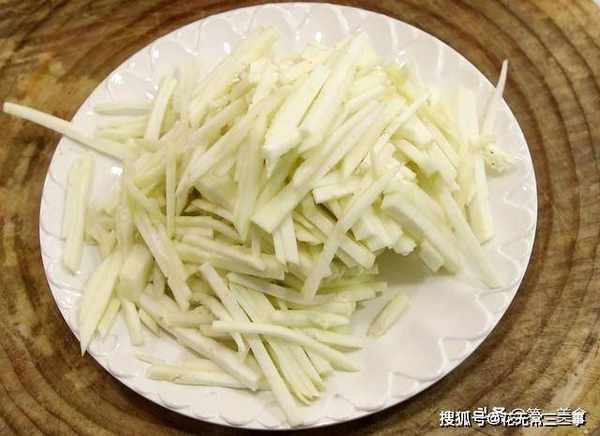 1.首先我们准备紫茄子一个,把外皮削干净,切掉两头,然后把茄子先切成均匀薄片,再改刀切成丝。