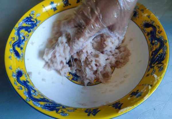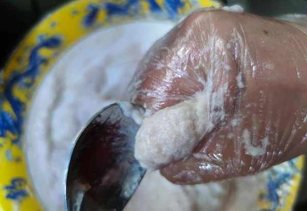 3.搅打好的鱼泥中加入干淀粉,搅拌至鱼泥抓起来不粘手为好。