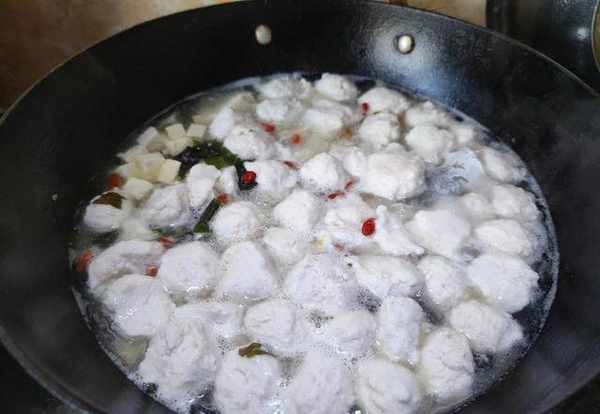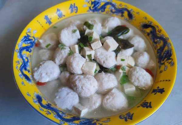 4.锅中入油爆香葱姜蒜,烹入料酒后添入开水,把锅中的料渣捞干净,水开后把锅端离火口,把鱼泥挤成大小均匀的鱼丸入锅,鱼丸全部下锅后把锅重新端上火口,加入切好的豆腐丁,烧开后撇净浮沫,加入盐和胡椒粉调味,撒入即食海苔和枸杞,滴几滴香油后连汤一起倒入加了葱花香菜的汤碗里即可。