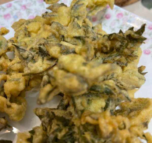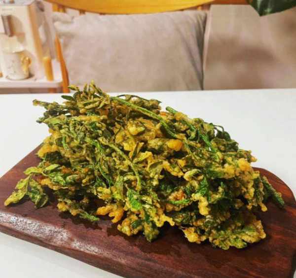 因为是专供春天的季节菜,错过了就没有,所以张妈妈在去火车站的路上看到有人挑着担子卖,又特别新鲜,想着女儿喜欢吃,就买了一点带过来。张雨桐从小就爱吃这个,加一勺面粉、一勺淀粉和一个鸡蛋,如果口味重还可以加一些花椒粉,做成面糊后,把花椒芽均匀裹上面粉,热油炸20秒,酥脆的花椒芽就做好了,有一股清香味,吃起来一点也不油腻。