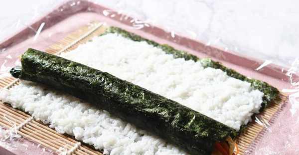 3、取一片紫菜,放上一些白米饭,再放上炒熟的蔬菜,用竹帘卷起来后用保鲜膜包紧,紫菜包饭就做好了,用刀切成片就可以吃了。