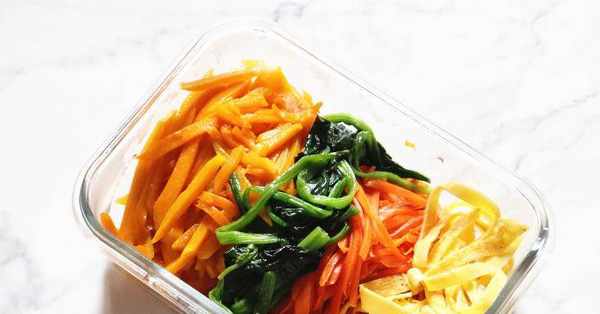 2、锅里留底油,倒入菠菜大火翻炒至变软,加入适量盐、香油炒匀盛出。锅里重新放油,倒入胡萝卜丝炒熟,加盐炒匀盛出,再把南瓜丝炒熟盛出。