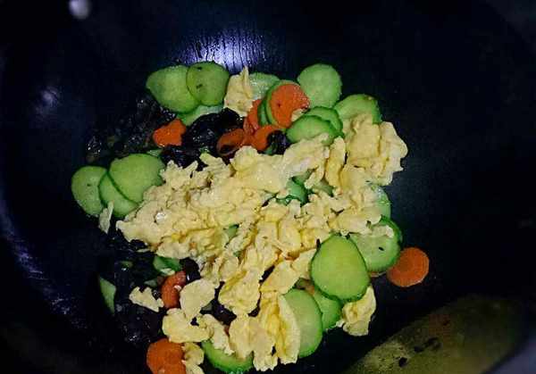 2、起锅烧油,倒入鸡蛋液大火煎熟,炒成大块后盛出。锅里留底油,下入葱蒜末爆香,倒入黑木耳、胡萝卜片大火翻炒2分钟,断生后加入适量食盐、生抽、鸡精,倒入黄瓜片翻炒均匀,最后倒入鸡蛋块,淋入适量清水翻炒均匀,即可出锅。