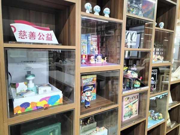 记者走进图书馆,首先映入眼帘的便是满面书架墙,颜色是偏咖啡色,有种进入主题博物馆的既视感。徐家汇作为海派之源,百年激荡所沉淀的海派文脉,形成了富饶的海派资源。书架墙整合海派资源,分为“海派之源”“非遗传承”“光启风采”和“慈善公益”四大版块,陈列了海派文化相关书籍、工艺品和文创作品。其中,慈善公益板块展现了令人心动的泡泡玛特热门IP系列作品,以“文创+公益”方式培育社区群众的新需求,丰富基层公共文化服务内涵。