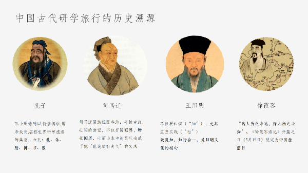孔子周游列国,传播儒学,博采众长,堪称世界研学旅游的典范,六艺:礼、乐、射、御、书、数;司马迁漫游祖国各地,寻访古迹,壮阔的游记,不仅开阔眼界,增长阅历,壮丽山水中的灵气也赋予他“疏荡颇有奇气”的文风;王阳明提倡不仅要认识(“知”),尤其应当实践(“行”),致良知,知行合一,是阳明文化的核心;徐霞客认为“达人所之未达,探人所之未知”,《徐霞客游记》开篇之日(5月19日)被定为中国旅游日。