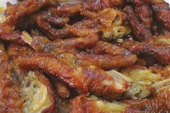 在广式早点里,这道虎皮凤爪是必点美食之一,鸡爪先经过油炸再进入冷水泡软,表皮皱褶如虎皮,之后再加入生抽、老抽等调料进行搅拌,上笼清蒸。凤爪香味入木三分,骨肉轻轻一吮吸,即可将鸡爪上的骨肉分离,味道全进入口腔之中。家人知道这也是我喜欢的一道菜,又特意给我多留些许,让我吃个够!