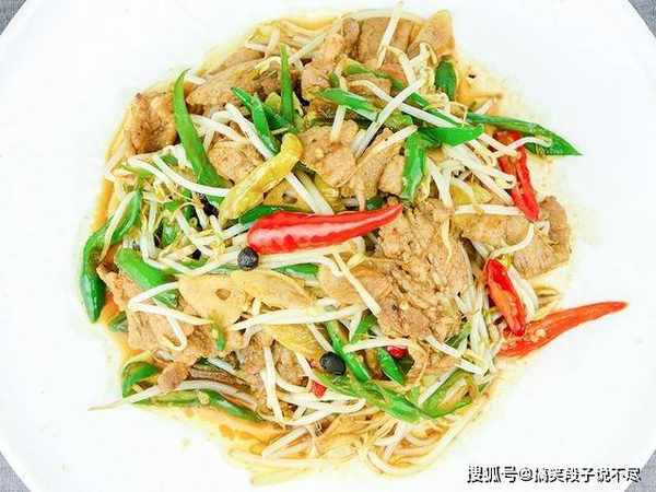 起锅烧油,油热倒入切好的肉片把肉片炒散,炒出猪油后倒入小米椒、泡椒、生姜、大蒜和豆豉翻炒出香辣味,倒入线椒颠锅翻炒至线椒断生,加入味精1克、胡椒粉1克、少许白糖、生抽10克、料酒5克、陈醋3克,开大火翻炒均匀给肉片入味,再放入绿豆芽颠锅翻炒至豆芽断生,就能出锅装盘了。