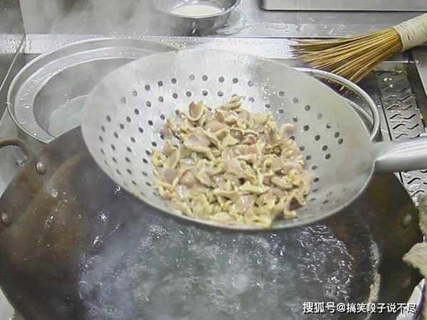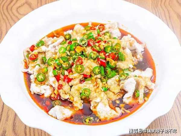 锅内再烧水,加入少许植物油,水开转小火依次下入肉片,防止肉片粘连成坨,小火把肉片煮至定型,用勺子轻轻推动,防止肉片粘在锅底,滑煮1分钟左右,肉片全部飘起后捞出控水放入盘中。