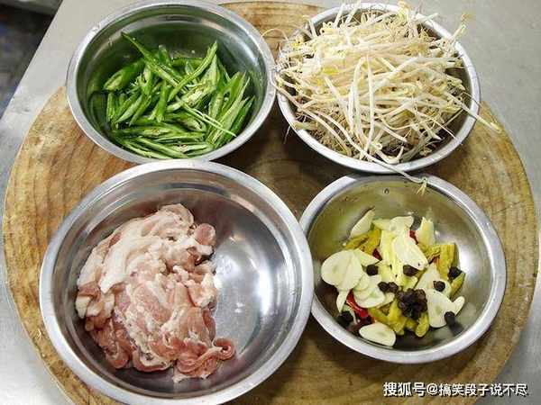 一块五花肉去皮切成薄片;一把绿豆芽备用;2根线椒斜刀切成片;3-5个小米椒从中间破开;一小把泡山椒也从中间破开;一块生姜切成菱形片;5-6颗大蒜切成薄片;一小把豆豉备用。
