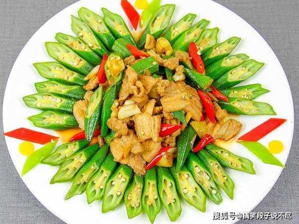 起锅烧油,油热倒入五花肉片炒出猪油,倒入姜,蒜爆香后倒入泡椒、红辣椒和秋葵翻炒,加入老抽、味精、白醋、生抽翻匀后就可以起锅装盘了。