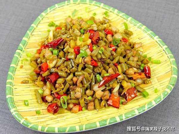 把锅烧热,不用倒油直接倒入酸豆角,翻炒2分钟左右炒干酸豆角的水分,倒出备用。