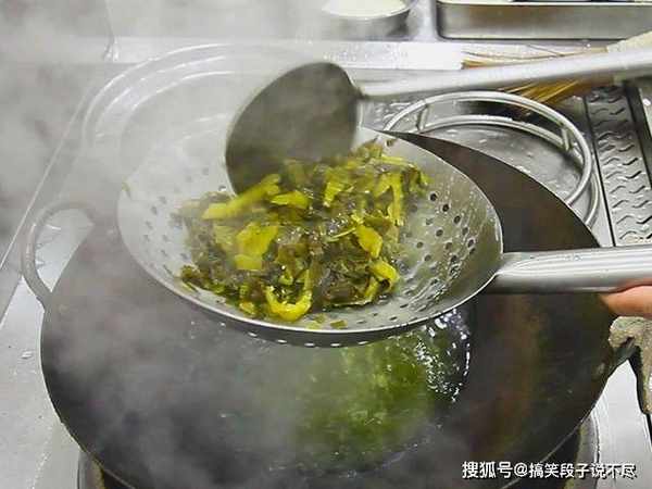 起锅烧水,水烧开倒入酸菜焯水1分钟,捞出冲水过凉挤出水分。酸菜是高盐食物,给它焯水是为了去除多余的盐分,洗掉腌制过程中的杂质,让酸菜的口感更好。