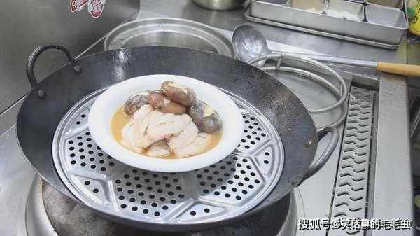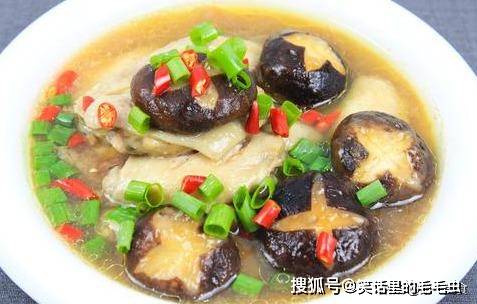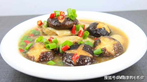 如图中所示那样,放上香菇,最后把汤汁也浇在盘中。