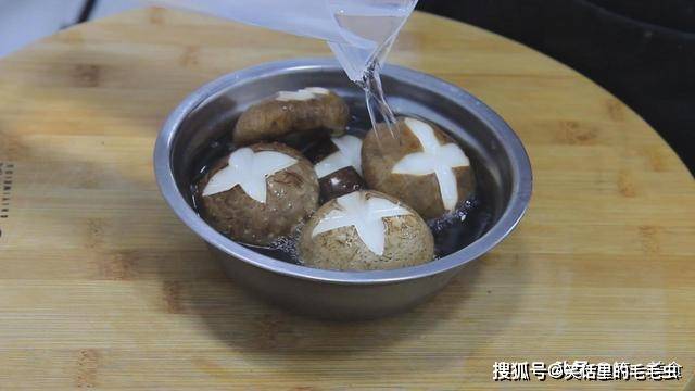香菇几个,切去香菇的根蒂,在背面切上十字花刀,放在盆中用清水浸泡起来。