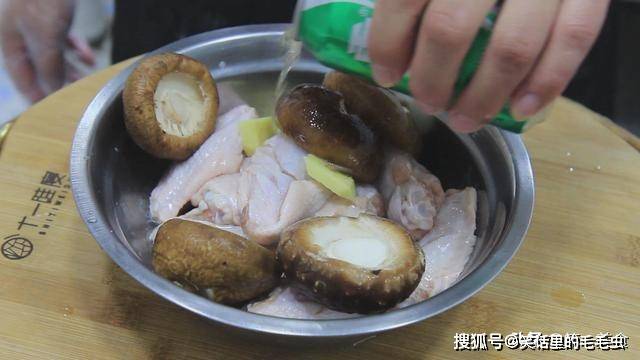 先把鸡翅放在清水中浸泡清洗干净以后,放在盆中,加入姜片和香菇。