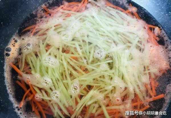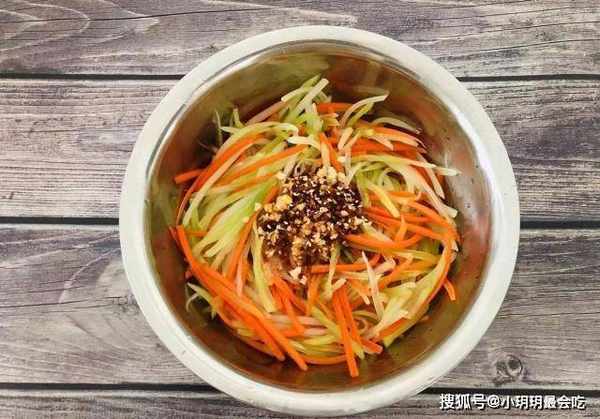 在锅中注入一定的清水后把水烧开,烧开以后我们按照顺序这三丝放入其中焯水,首先是土豆,土豆焯水所需要的时间是三十妙,焯水完以后就立马捞出并放入到冷水中,接着是莴笋丝和胡萝卜丝,这两种只需要大约十五秒就可以了。同样的焯水完以后就放入到冷水中冷却,把他们全部都装在一个大一点的盆里,接着把一开会剁好的蒜蓉,以及盐,白糖,醋,生抽,香油,和油辣子拌入,搅拌均匀以后就可以食用了!