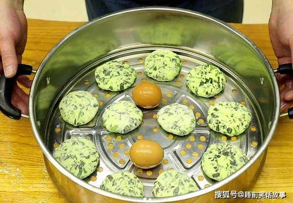 3.篦子上刷上一层油防止粘连,把饼坯一个一个放进去,中间稍微留点缝隙,防止蒸熟以后粘在一起,再放入两个鸡蛋,等会儿用来调酱,水烧开以后大火蒸15分钟即可。