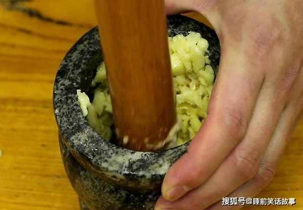 4.15分钟以后把饼坯取出,把鸡蛋剥去外皮放入蒜臼中,加入适量的大蒜捣碎。