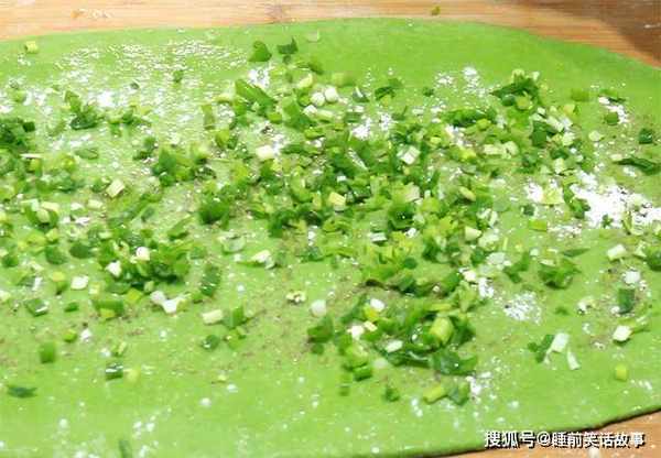 4.在面片上挤上油,用刷子刷均匀,撒一层薄薄的椒盐再撒上面粉,放上小葱粒,从下面往上卷,把面片卷成长条,切成大小均匀的面剂。