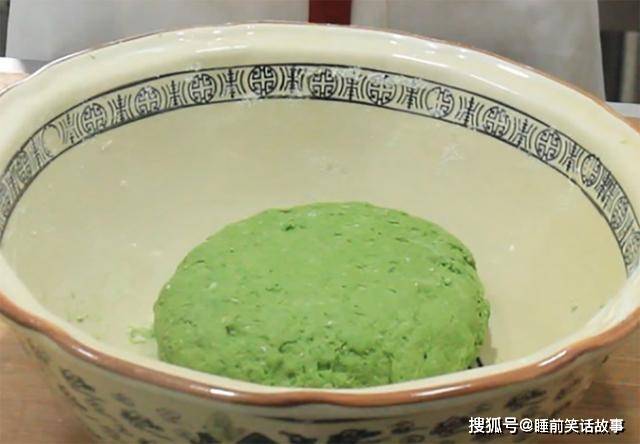 2.盆中加入面粉300克,酵母3克,用菠菜泥和面,把菠菜泥和面粉揉和均匀,揉成光滑的面团,用盘子盖住发酵一个小时。小葱几根,破开后切碎备用。