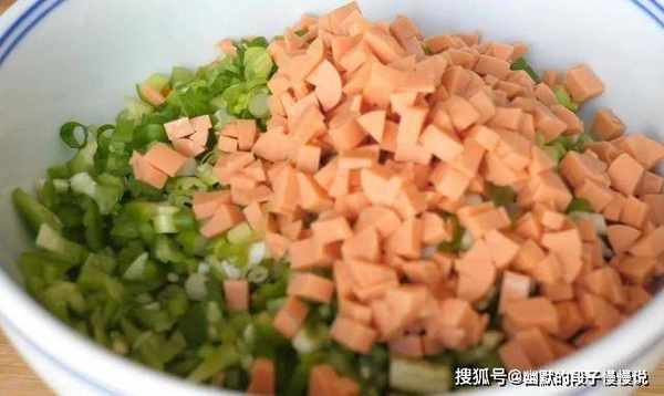 2、再准备胡萝卜、青椒、火腿等,都切碎,放碗中。