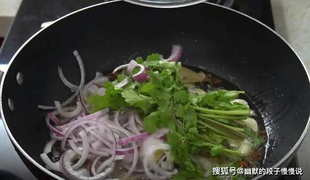6、另外热锅放油,放洋葱、香菜、大蒜、生姜,爆香,炒出香味,1分钟捞出配菜,留下香油。