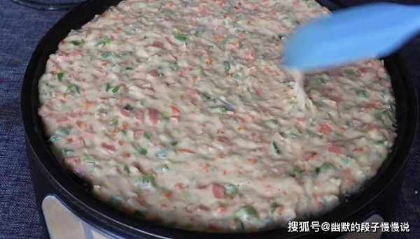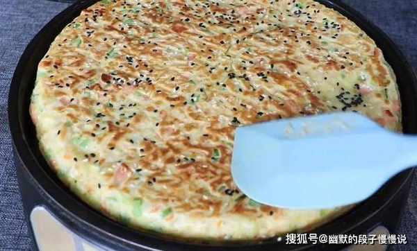 7、倒入搅拌好的面糊,平铺摊开,成一张大饼。表面再撒一层芝麻。