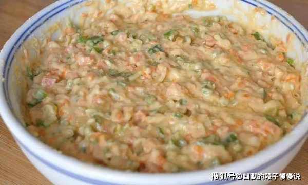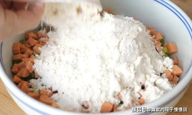 3、将虾皮、面粉、酵母倒在胡萝卜、青椒、火腿碗中。搅拌均匀。