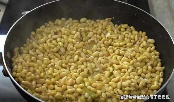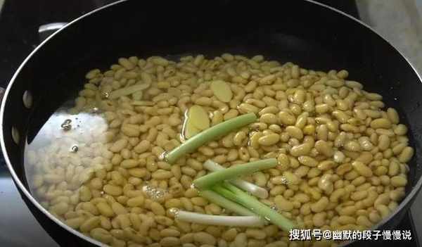 5、此时,黄豆已经煮熟了,挑出里面的葱段和姜片,捞起来备用。