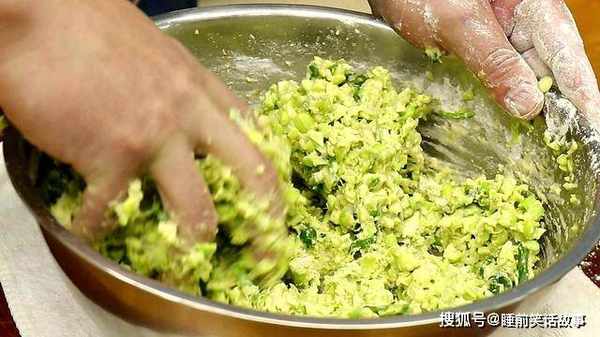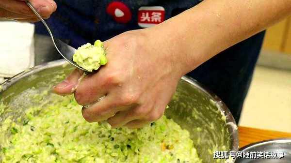 准备一碗蚕豆,给它切成碎粒。带点颗粒感比较好,更有嚼头。几根青蒜苗提味用,切成细圈搁一块儿。然后,磕进去俩母鸡蛋。加盐、鸡粉、十三香调味,先把鸡蛋和蚕豆掺匀。