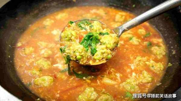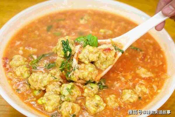然后转小火,开始下丸子。抓一把馅料,从虎口挤出丸子,用小勺挖进锅里面。丸子一定要 小火下,全部下完以后,稍微调大一点火力。剩下的那点面糊也别浪费,加点水调成糊。大概煮个两三分钟,丸子全部飘起来,基本上就熟了。