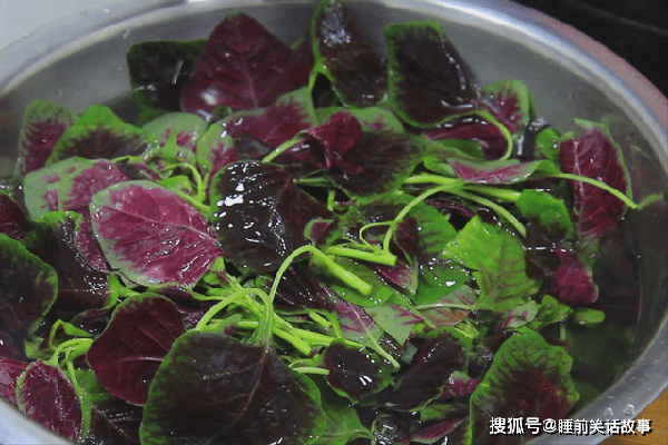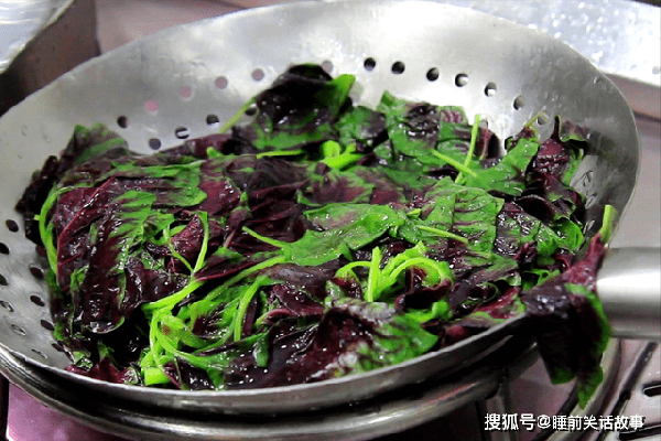 锅内烧水,放入一勺植物油,防止苋菜中的营养流失、保留翠绿的色泽,水开后放入苋菜,快速焯烫10秒钟倒出来,用清水冲凉降温。