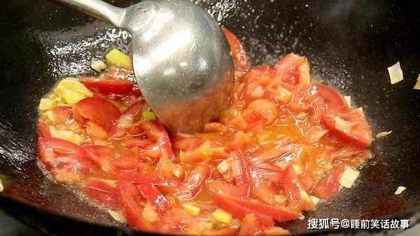 起锅烧油,放葱花、蒜片爆香。把番茄倒进去,大火翻炒出汁。番茄炒化,熬成沙以后,加进去半锅水。加盐、鸡粉、胡椒粉、十三香,半勺生抽调味。大火多咕嘟个两三分钟,把番茄味煮出来。